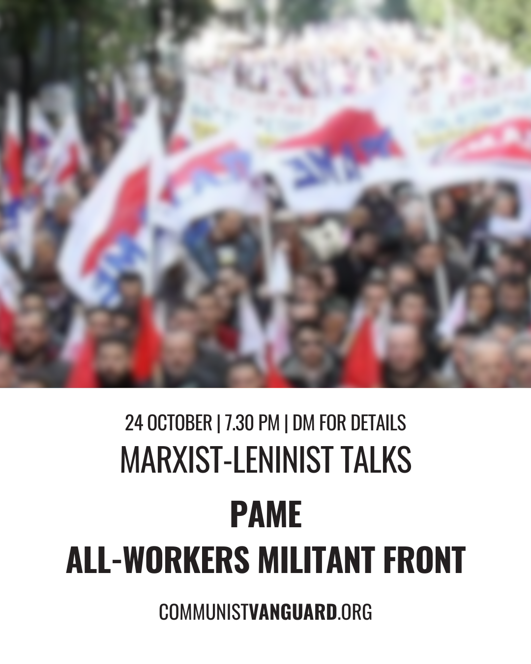 This Friday, the 24th October, we will discuss how P.A.M.E. has achieved widespread support within the Greek labour movement, its relationship to the broader political project of the KKE, and its role in shaping worker-led mobilisation. As Marxist-Leninists, we must critically examine the function of trade unions in revolutionary praxis, not only to understand their potential, but also to learn from their limitations. P.A.M.E.’s deeper significance lies in its disciplined, class-conscious organising and our task is to understand how such formations contribute to building a vanguard rooted in the everyday struggles of workers.